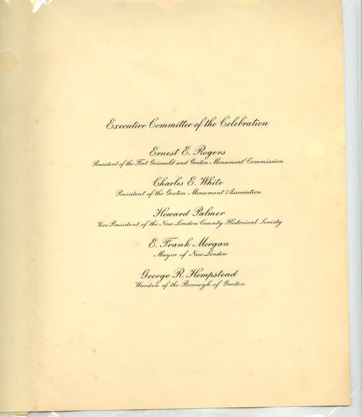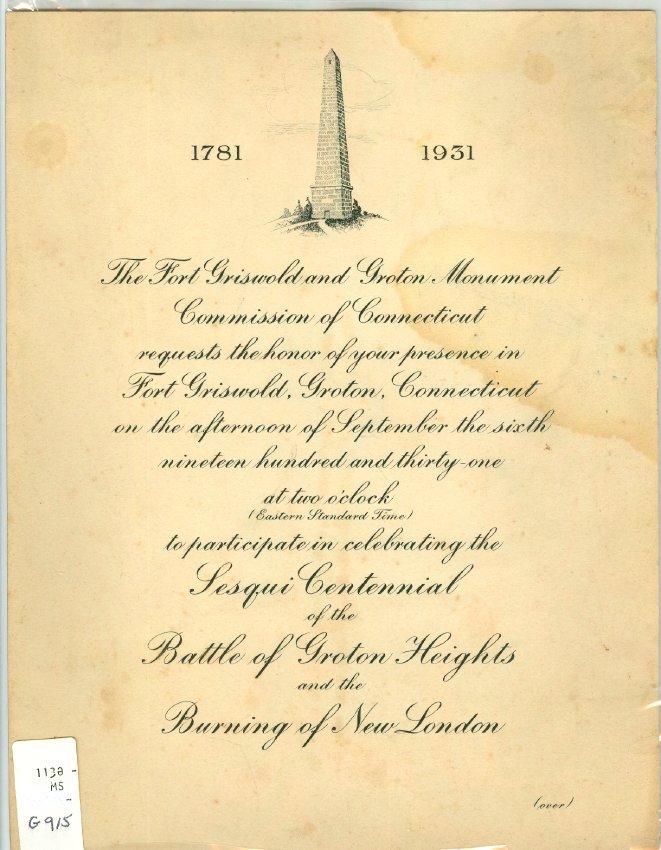 Invitation to celebration Sept. 6, 1931 at 2 PM., the Sesqui Centennial of the battle of Groton Heights and the burning of New London. List of the executive committee. One piece. 7 1/2" x 9 3/4".