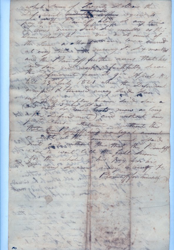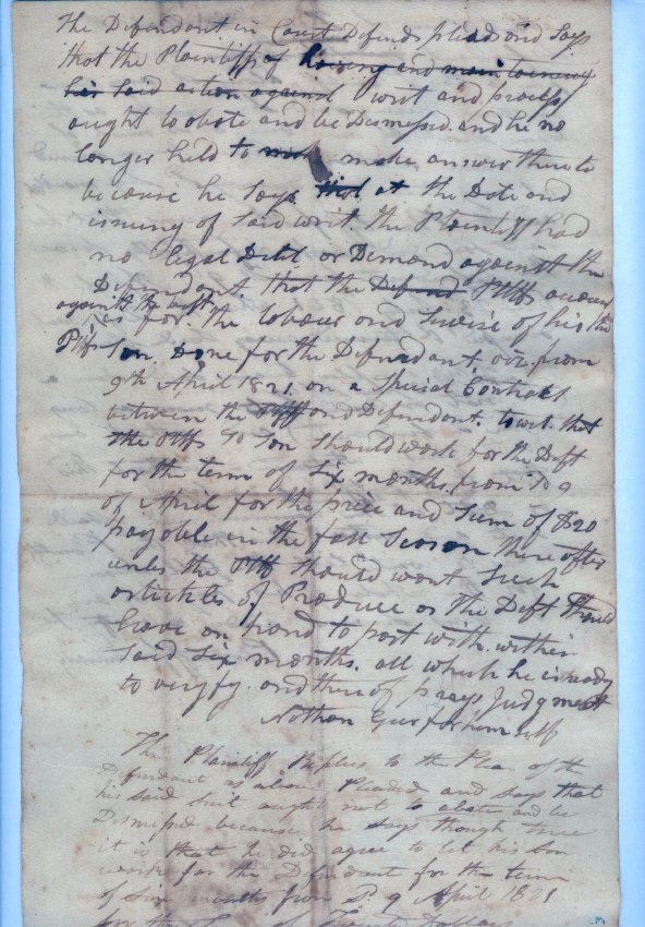 Statements by defendant Nathan Geer "for himself" and unnamed plaintiff "for himself" in the matter of defendant's pursuit to recover $20.00 for his son's labor over the period April 9 1821 to July 23 1821. One piece. 8 1/2" x 14".