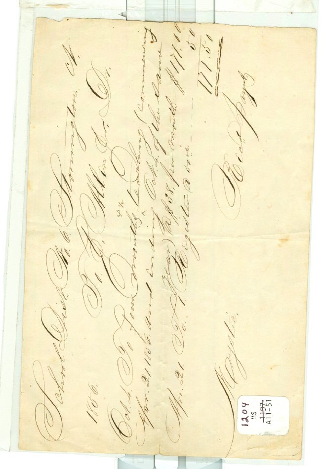 A bill to I. Allyn for teaching services dated School District #6, Stonington, CT. One piece. 8 1/2" w x 5 1/2". Dated 1856