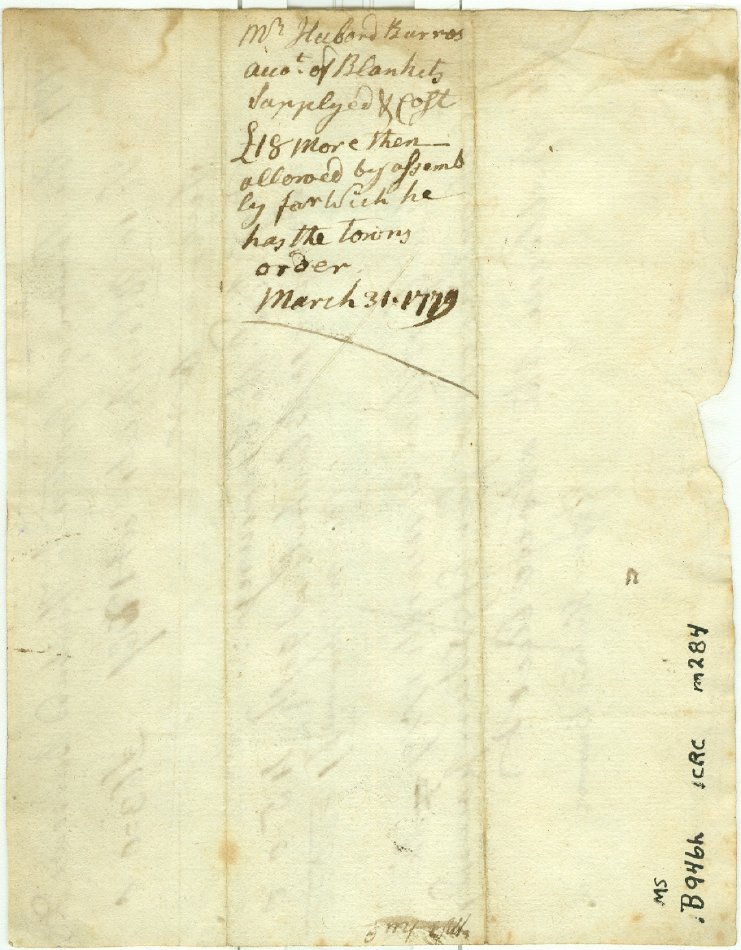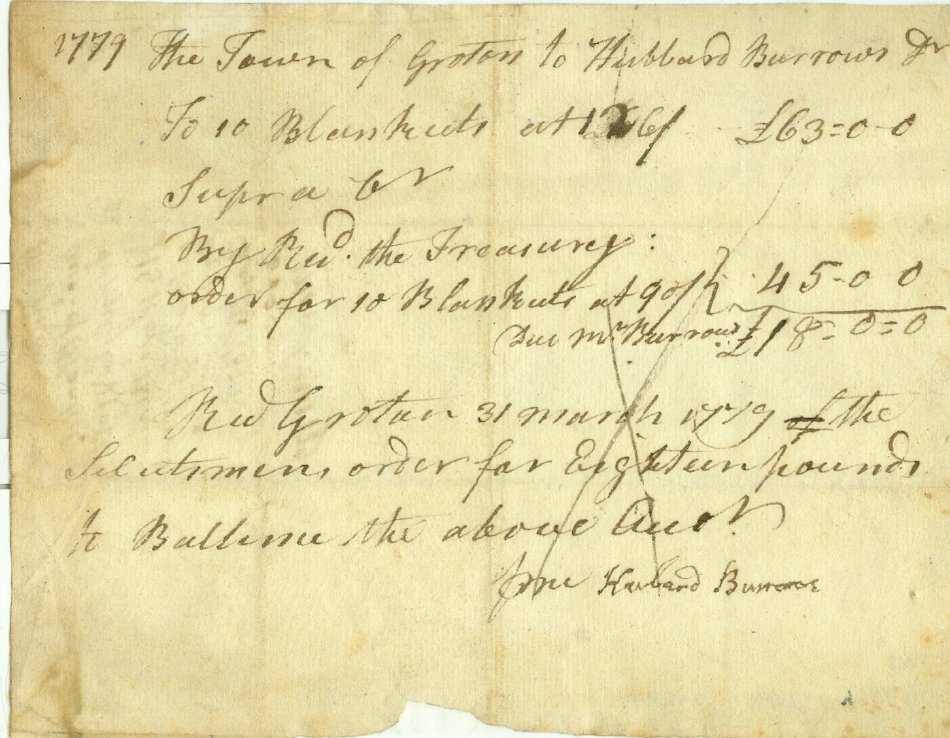 Bill to the Town of Groton from Hubbard Burrows, 1779, for 18 pounds due him for paying more than assembly allowed, in purchase of 10 blankets ordered by the town. One piece. 5 5/8" x 7 1/8".