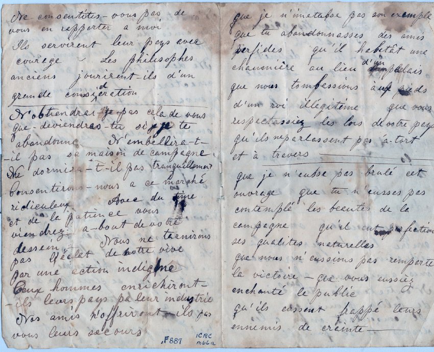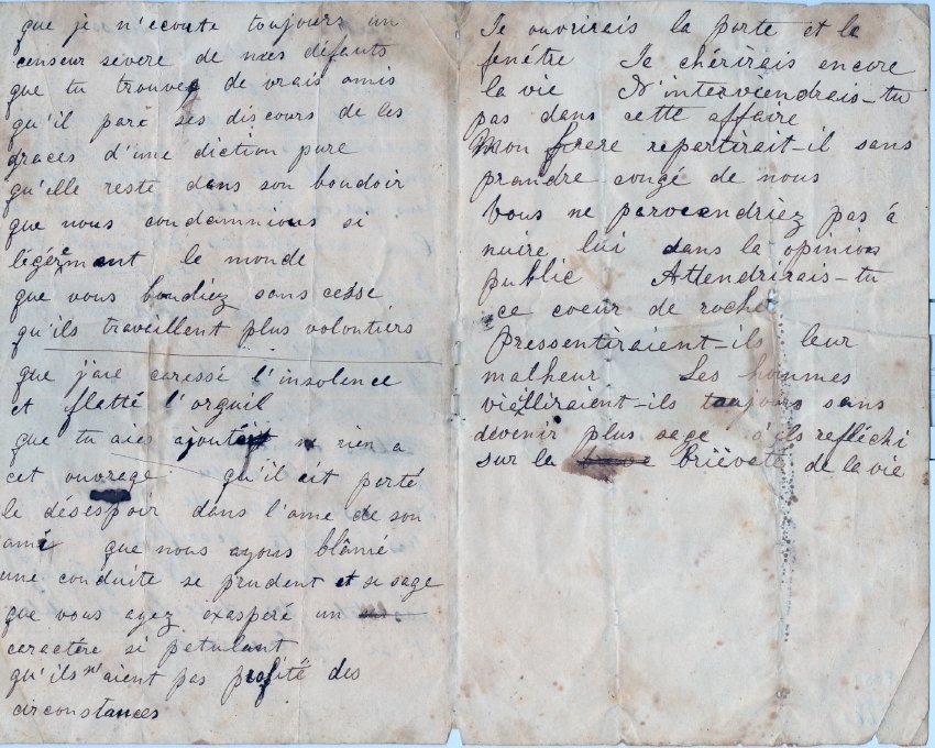 Two folded pages of practice in the French language, with pedantic phrasing of some of it, as though writer were writing a sermon, and several errors. Probably ca. 1830–40. Two pieces. 7 15/16 x 7 7/8"