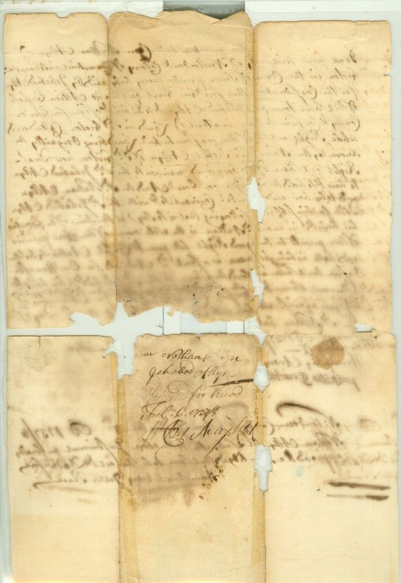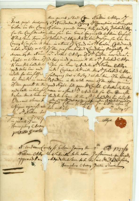 Deed to property in Groton, dated January 1737/8 from Nathan Allyn to Ichabod Allyn. Signed by Humphrey Avery, Justice of the Peace. Recorded February 6, 1737/8. Witnessed by Humphrey Avery, Priscilla D[?]. One piece, irregular edges. 8" x 13 3/4".