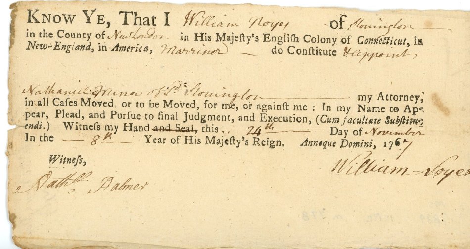 Pre–printed "fill–in" general power of attorney from William Noyes to Nathaniel Miner, both of Stonington, dated Nov. 24, 1767. Witnessed by Nathaniel Palmer. One piece. 6 1/2" x 3 1/2".