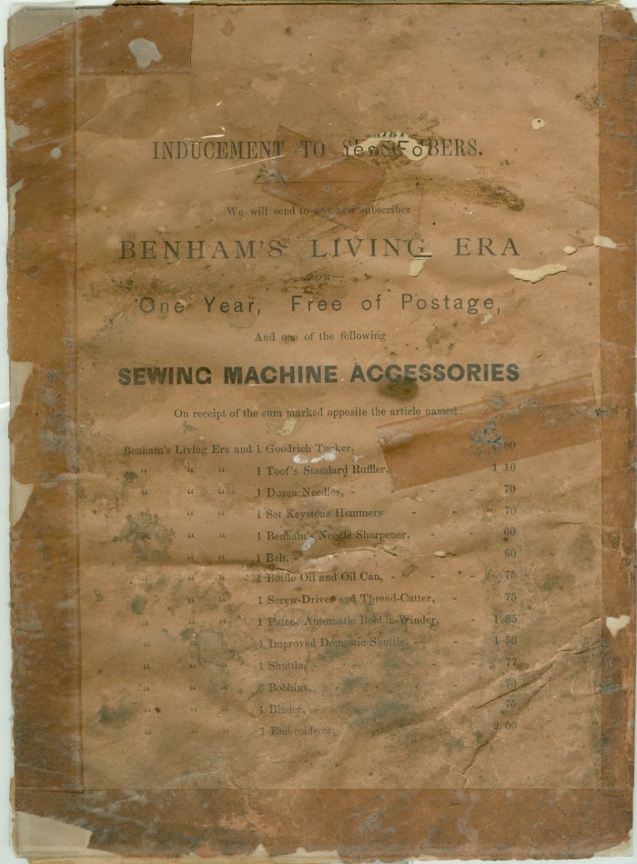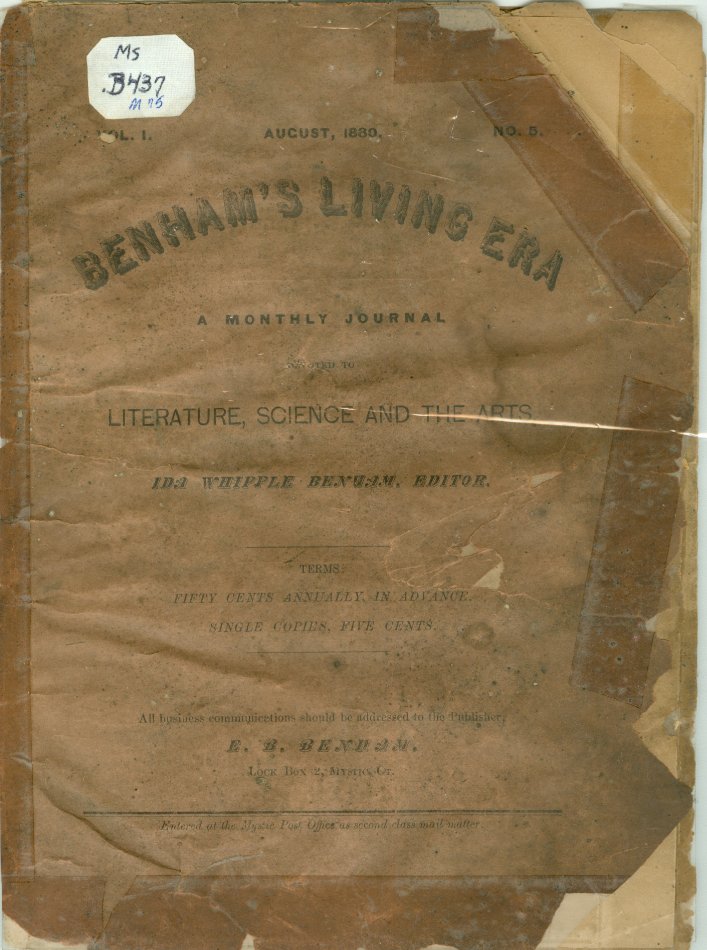 A six page machine printed booklet titled "Benham's Living Era" with heavy paper cover; Vol 1, No. 5 Mystic, CT ; B. B. Benham ca 1880. A monthly journal devoted to literature, science & the arts. Ida Whipple Benham, Editor. One piece. 7 3/4" x 9 1/4"