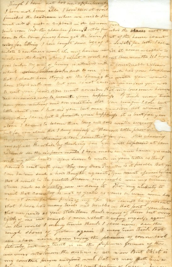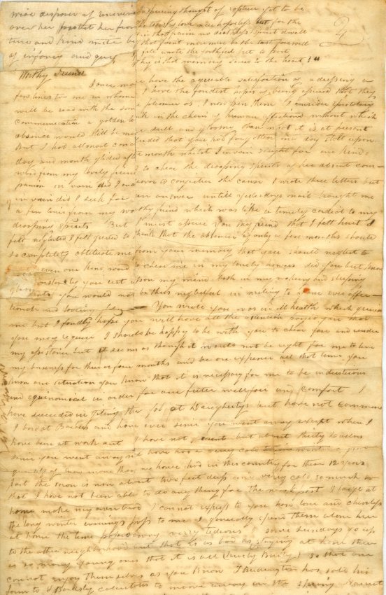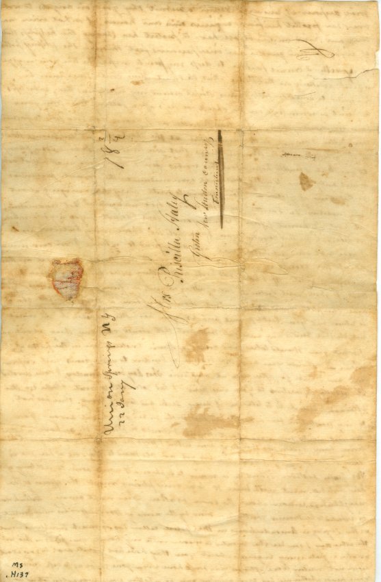 Letter from Jabez D. Haley to Priscilla Halley of Groton, Connecticut postmarked 22 Jany Union Springs, NY. Haley expresses considerable emotion at his separation from family and about a young child. One piece. 15 3/4" x 12 3/4". Folded.