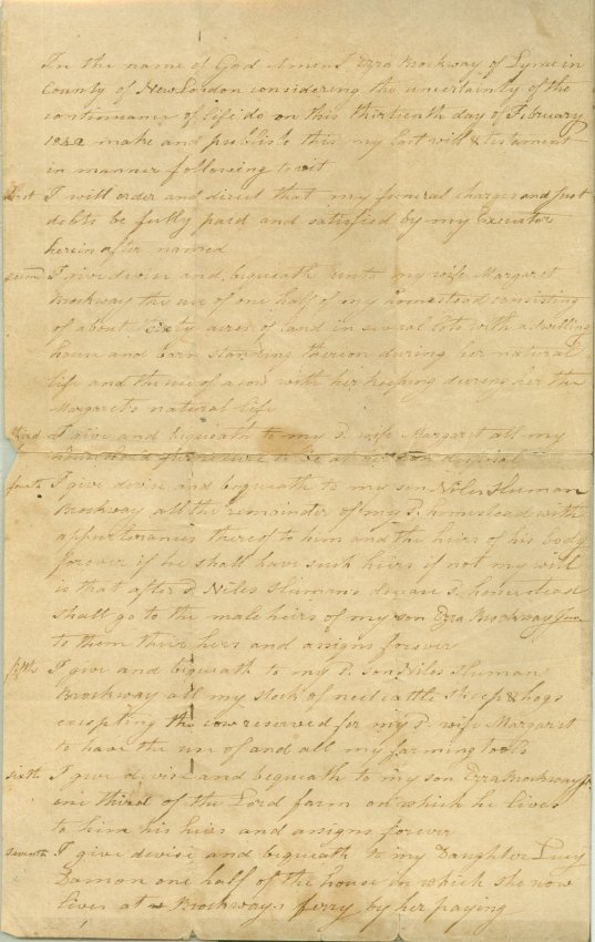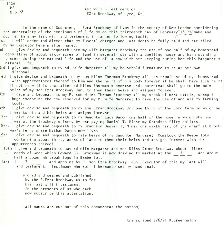 Last will and testament of Ezra Brockway dated Feb. 13, 18[42]. Mentions wife Margaret, sons Niles Sherman, and Ezra, Jr.; daughters Lucy and Margaret Comstock, grandson Daniel T. Miner.