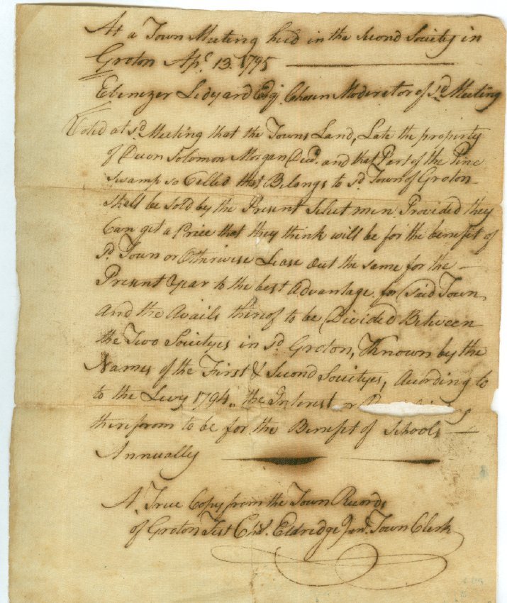 Report of town meeting held in 2nd Society, Groton, Apr. 13, 1795, Ebenezer Ledyard moderator, that the town should sell land late owned by Solomon Morgan decd., and the part of the Pine Swamp that belongs to the town, provided they can get a price the Selectmen think will benefit the town, money to be divided between 1st and 2nd Societies, interest to be for schools. True copy attested to by Christopher Eldredge, Jr. One piece. 7 1/4 x 6".