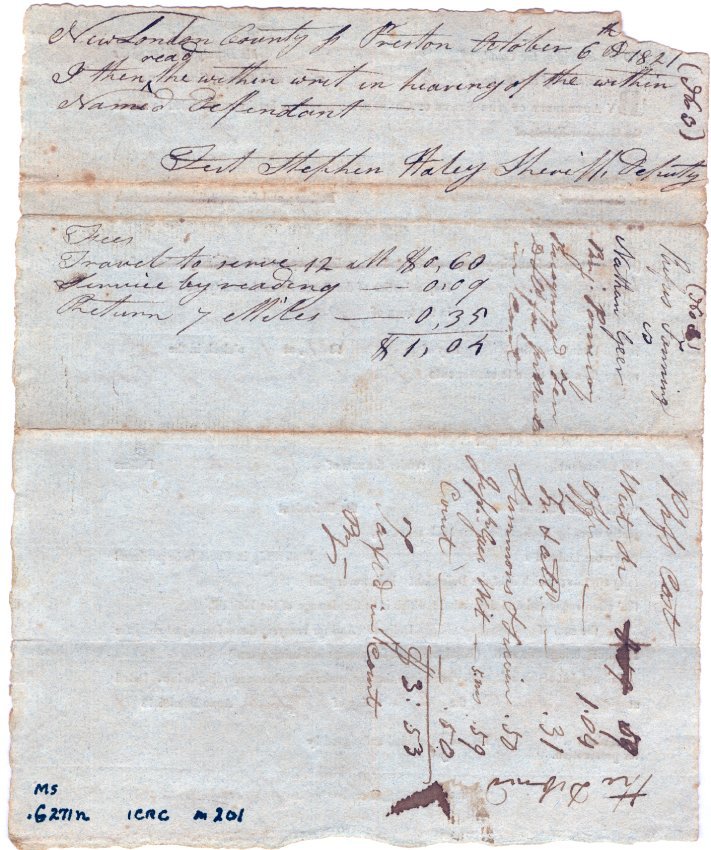 Preprinted form. Summons directing Sherriff of New London County or constable of the Town of Preston to summon Nathan Geer of Preston to appear before William Williams on October 2, 1821 to answer complaint by Rufus Fanning regarding indebtedness of $20.00 to said Fanning. Signed by Benj. Pomeroy, Justice of Peace. Signature of Stephen Haley, Deputy Sherriff on opposite side acknowledges receipt of summons. Sherriff's acounting of service and processing fees recorded. Blue paper. One piece. 7" x 9".