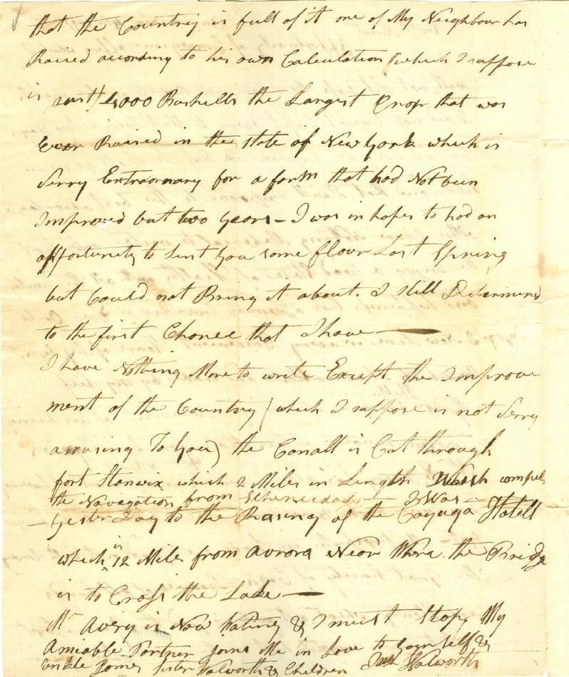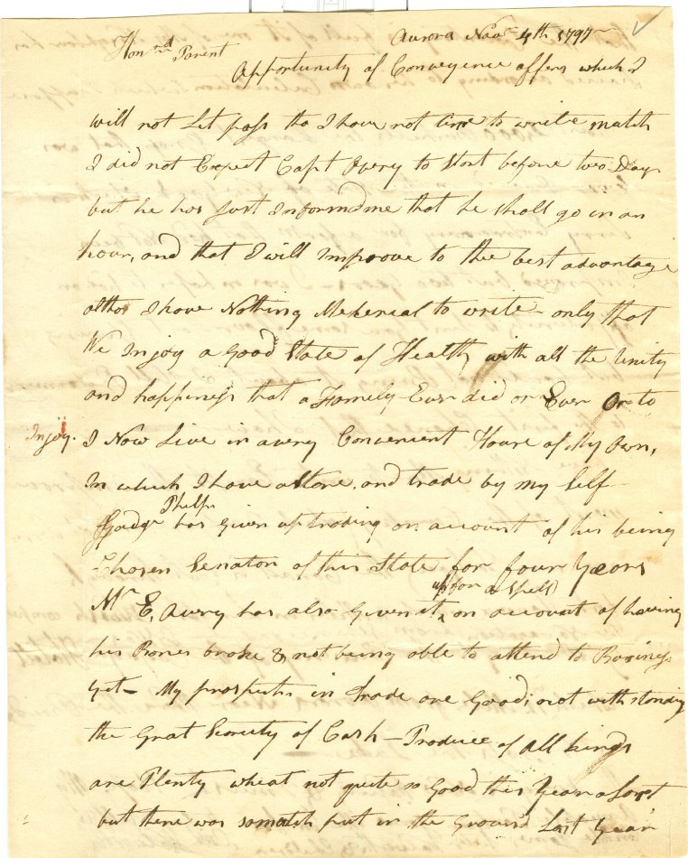 Letter to "Honored Parent" dated Aurora, November 4th, 1797 signed by Samuel Walworth. Letter mentions Capt. Avery, is posted to Mrs. Hannah Avery, Groton and bears no postal markings on the outer surfaces. One piece. 14 1/2" x 9"