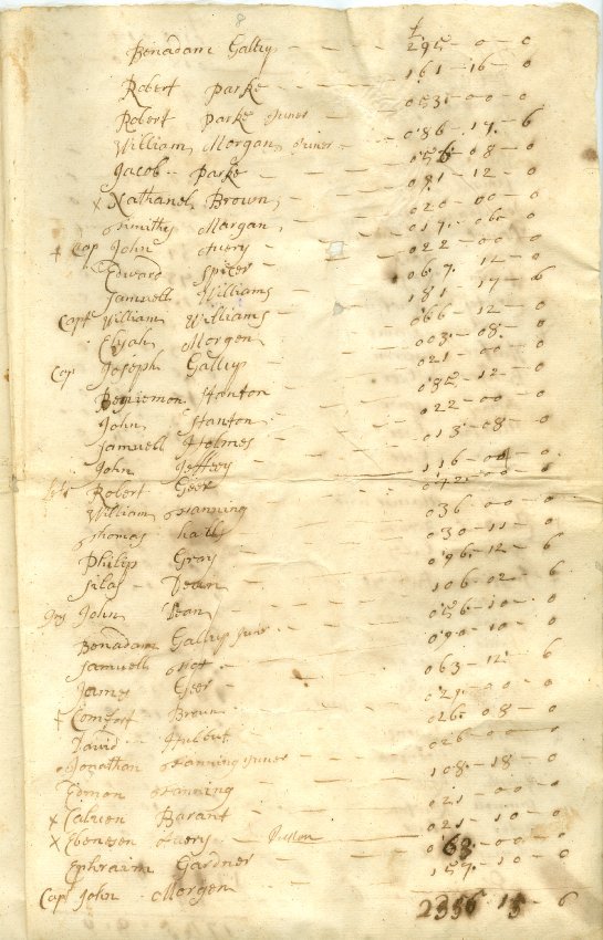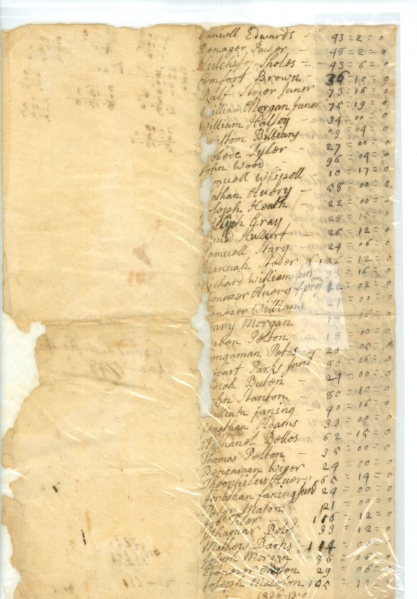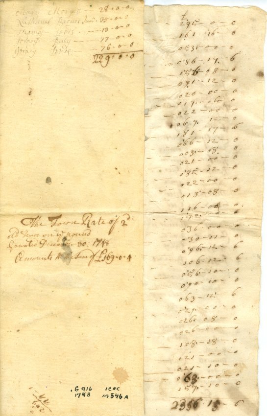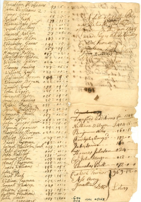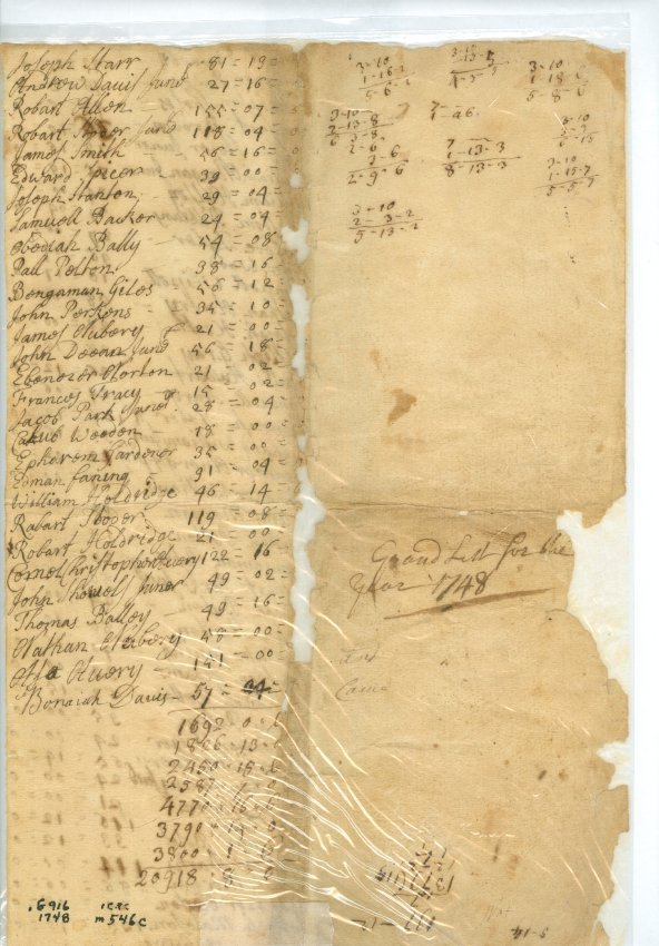 Groton tax list for the year 1748. Two pieces. 8" x 11 3/4" and 12" x 12 1/4" (folded). Handwritten surname index by Eva Butler included.