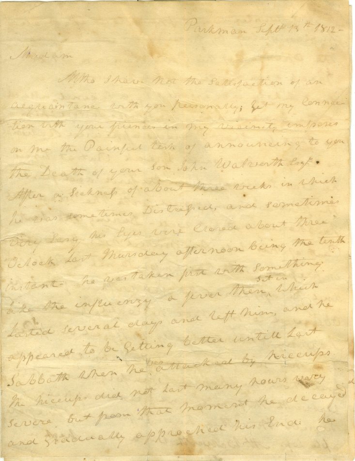 Two page letter dated "Parkman, September 13th, 1812" to "Madam" and signed by Robert B. Parkman notifying Mrs. Hannah Avery of the death of her son John Walworth. Posted to Mrs. Hannah Avery, Groton Post Office, CT. Return address is R.B. Parkman, Postmaster, Parkman, Ohio. Free written on address panel. One piece, folded. 15 3/4" x 9 3/4".