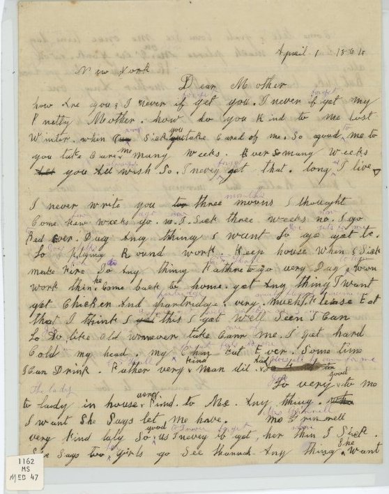 Letter from Hannah to Mrs. Buddington dated April 1, 1864 from New York. Hannah says that she will never forget how Mrs. Buddington took care of her when she was sick. One piece. Includes typewritten transcription. 7 1/4" x 9 1/4".