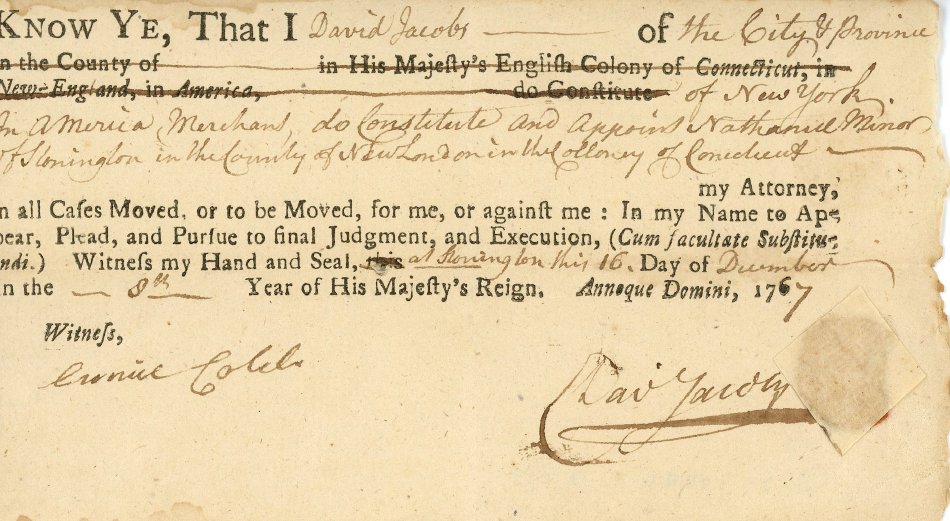 Pre–printed "fill–in" general power of attorney from David Jacobs of New York to Nathaniel Miner of Stonington, dated Dec. 16, 1767. Witnessed by Daniel Coles. One piece. 6 1/4" x 3 1/2".