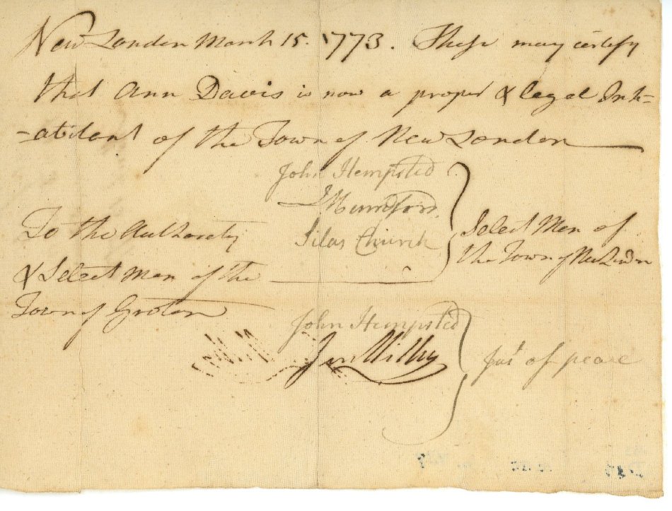 Certificate, New London, March 15, 1773, stating Ann Davis is a legal inhabitant of New London, addressed to the Selectmen of Groton. Signed by John Hempsted, T. Mumford, Silas Church, J.P.'s John Hempsted, J. Miller. One piece. 5 1/4 x 7 1/8".