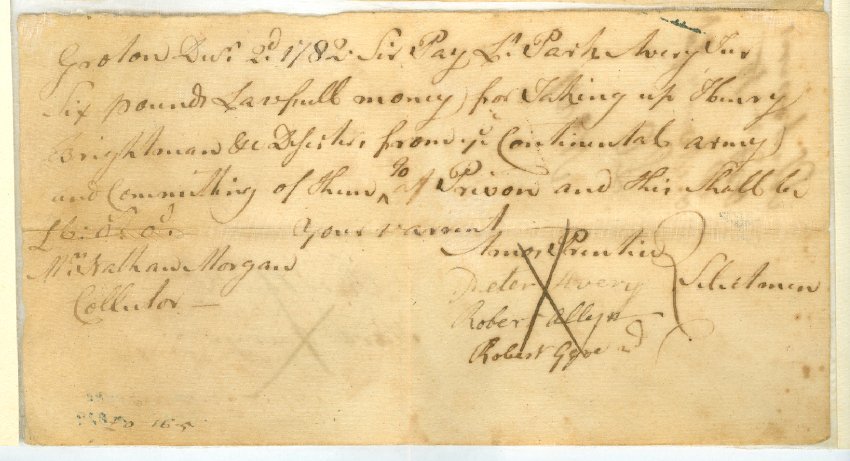 Order from the Selectmen of Groton to John Lister, collector of rates, to pay six pounds bounty to Solomon Williams. Dated June 3, 1778. One piece. 7 1/2" x 5".