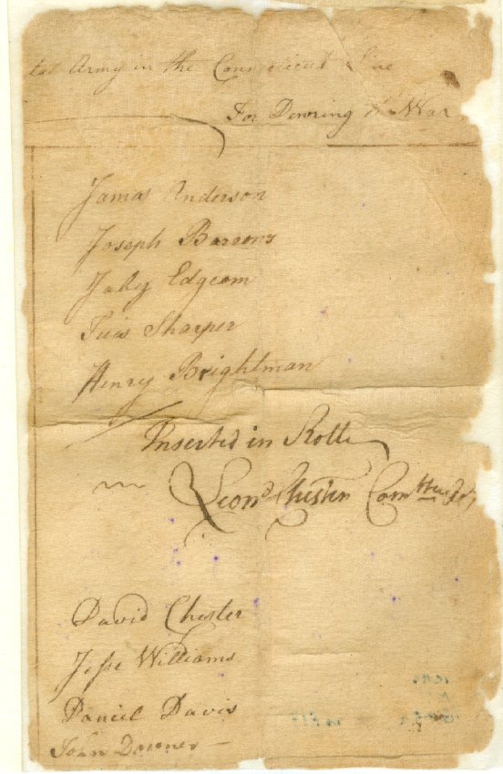 List of soldiers enlisted in the Connecticut line of the army. Undated. One piece, irregular edges. 4" x 6 1/2".