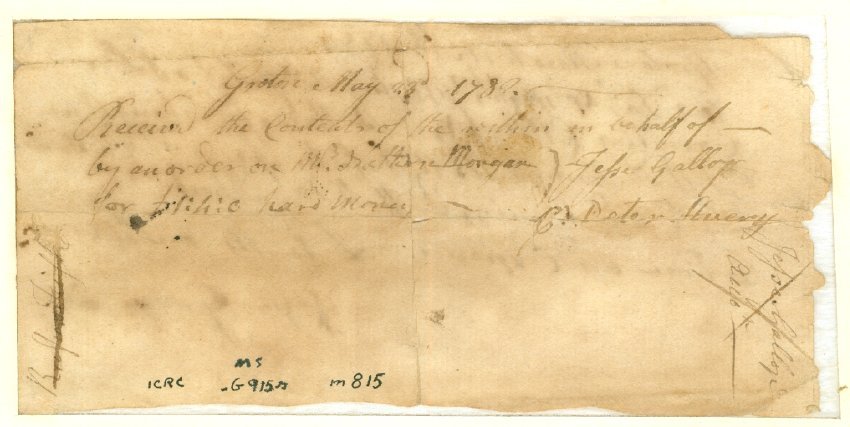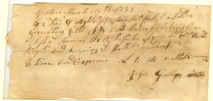 Receipt to the town of Groton by Jesse Gallup for four pounds fourteen shillings. Gallup assisted Thomas Hallet in taking Elisha Fanning as a deserter from Colonel Webber's regiment. One piece. 6 1/2" x 3".