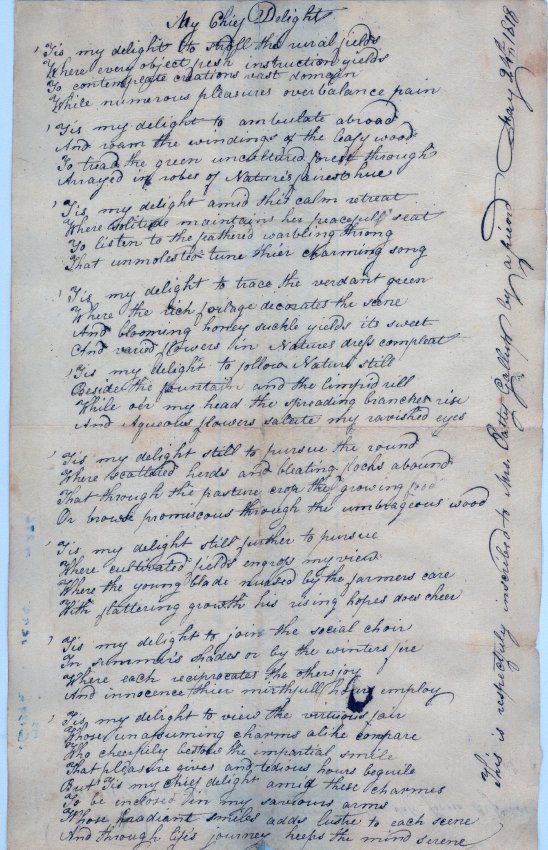 Poem inscribed to Mrs. Patty Gallup by "a friend." Entitled My Chief Delights. One piece. 7 3/4" x 12 3/4".
