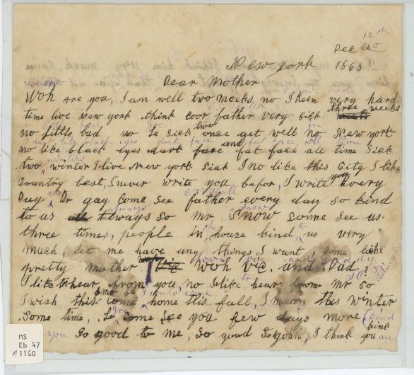Letter from Hannah to Mrs. Buddington dated December 12, 1863 from New York. Describes how Hannah doesn't like the city., but she likes the New York countryside. Includes typewritten transcription. One piece. 7 1/2" x 6 3/4".