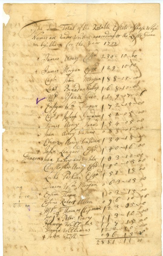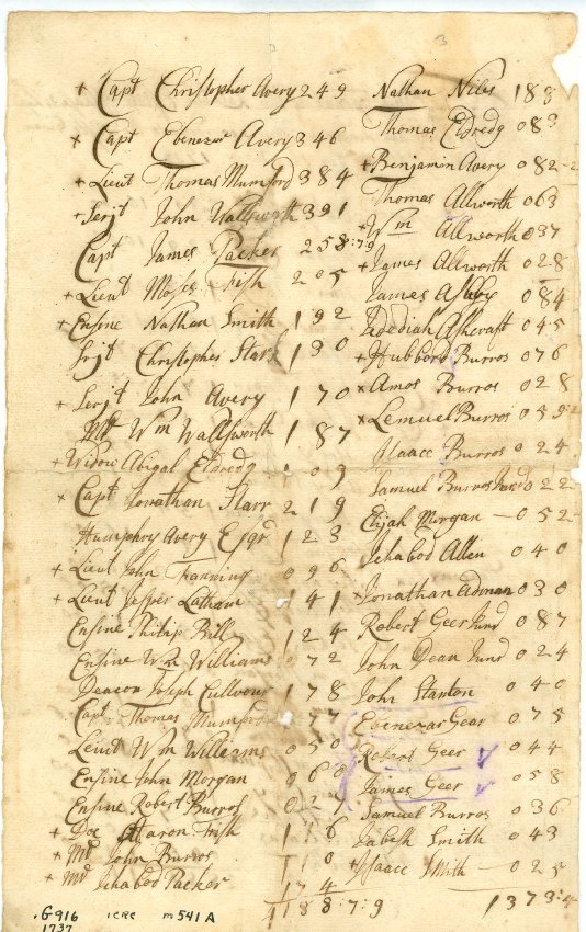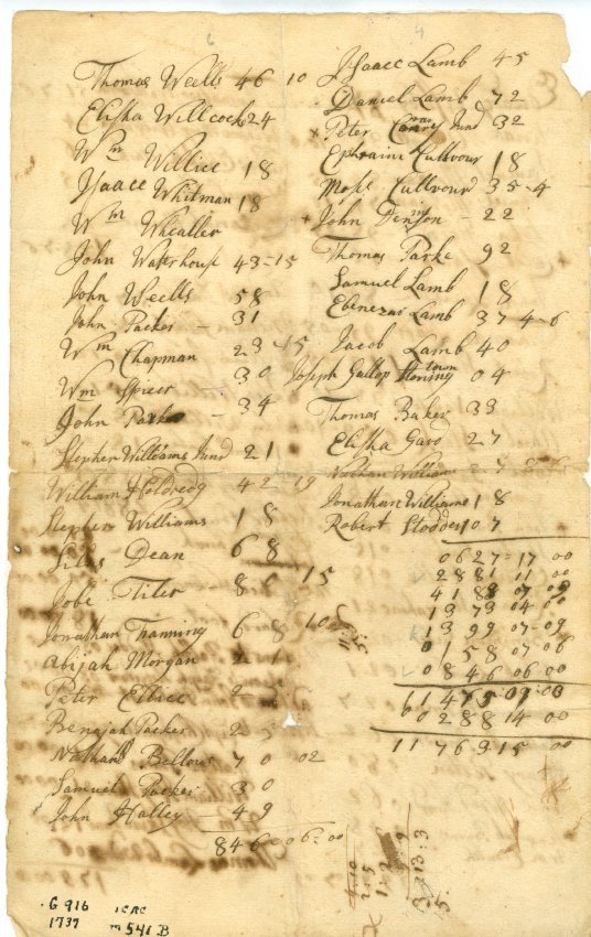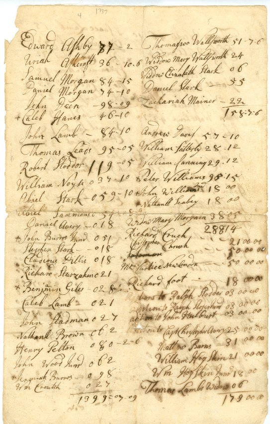 Groton tax lists for the year 1737. Two pieces measuring 7 1/2" x 12 1/4".