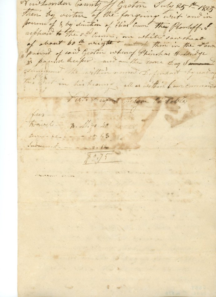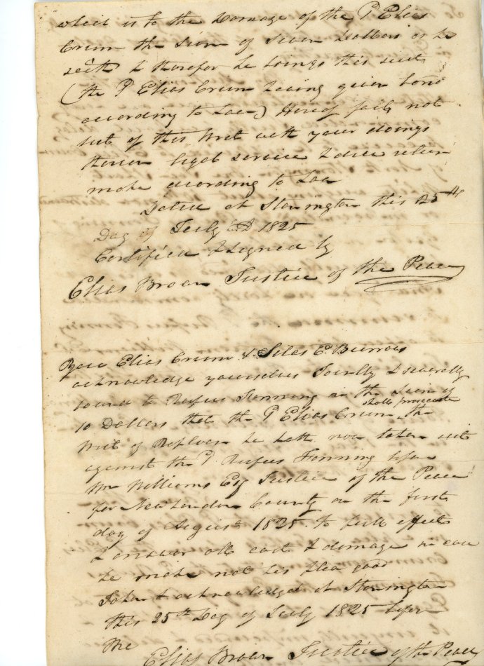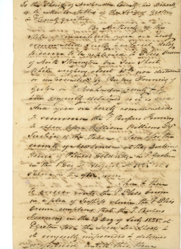 Writ of replevin dated Groton, CT, July 25, 1825 wherein Elias Crumb of North Stonington claims a sow/shoat impounded by Rufus Fanning to be his property. Signed by Elias Brown, J.P. Subsequent entries on the writ mention Silas Burrows and Wm. Williams (J.P.) and Phineas Holdridge. One piece, folded. 15 1/2" x 12".