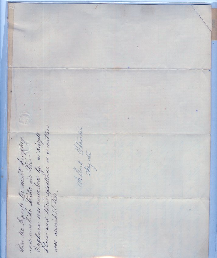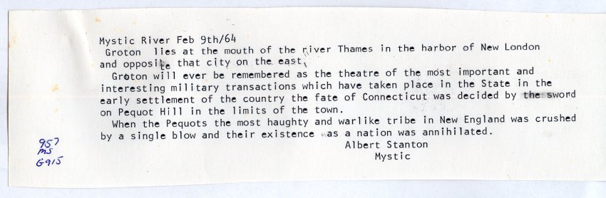 Letter written Feb. 9, 1864 at Mystic River describing Groton. Written by Albert Stanton but does not say to whom it is wirtten. One piece, folded. 10" x 8".