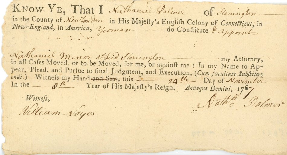Pre–printed "fill–in'" general power of attorney from Nathaniel Palmer to Nathaniel Miner, both of Stonington, dated Nov. 24, 1767. Witnessed by William Noyes.One piece. 6 1/2" x 3 1/2".