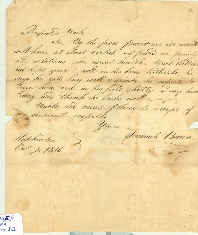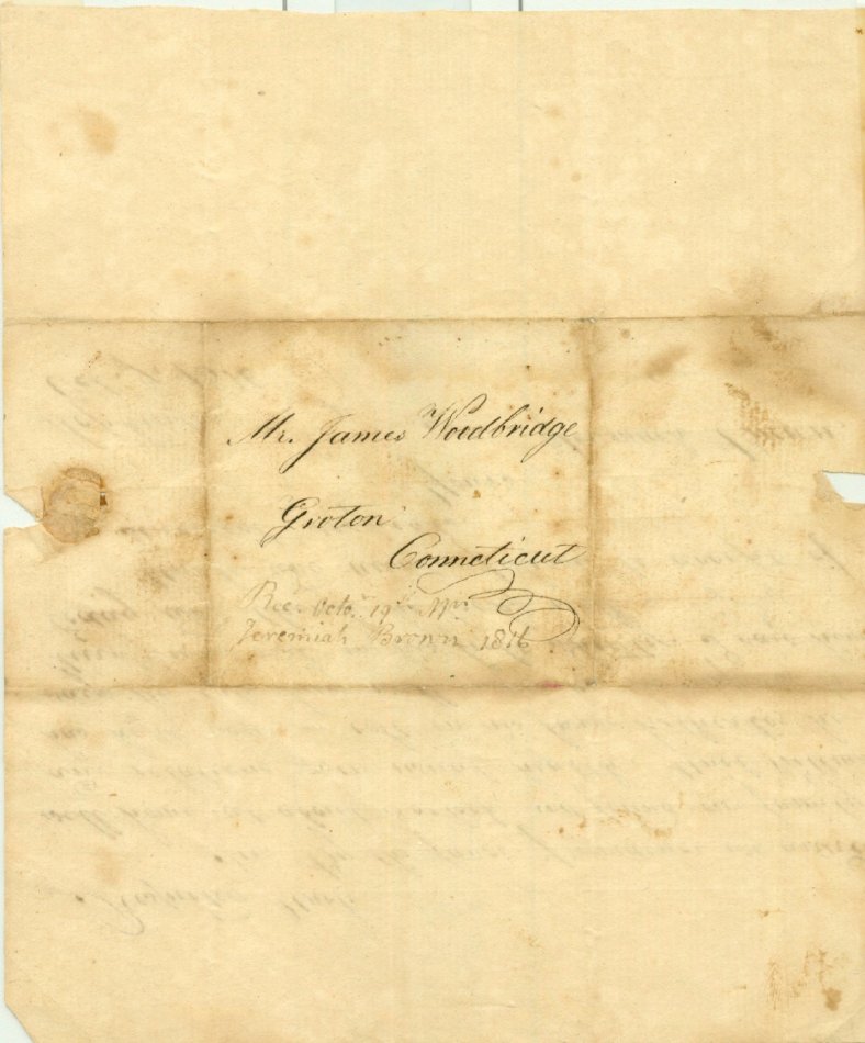 Letter to J. Brown's uncle, James Woodbridge of Groton, Conn. Dated Oct. 9, 1816. Tells of arriving home safely and about a colt his uncle William is keeping for Mr. Woodbridge. One piece, irregular. 6 1/4" x 7 1/2".
