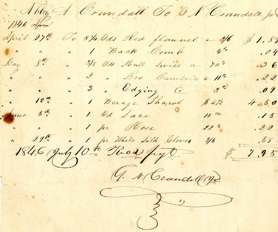A bill with dates ranging from April through June 1846 made out by Abby A. Crandall to G.N. Crandall, Jr. for fabrics, sewing materials and a pair of gloves. One piece. 7 1/2" x 6 3/4".
