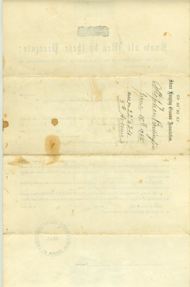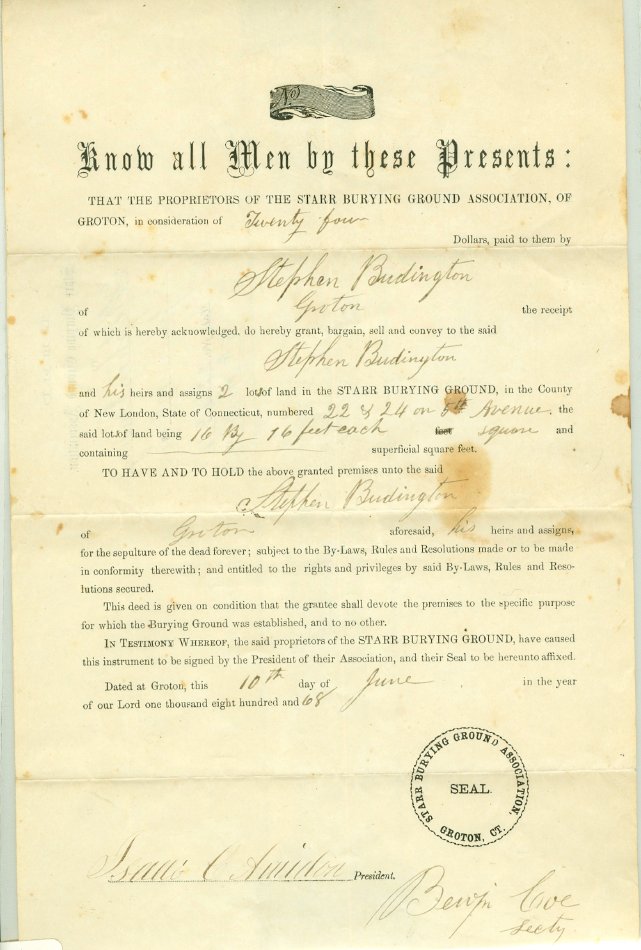 Deed to 2 plots of land in the Star Burying Ground in Groton #22 and #24 for $24. Dated June 10, 1868. One piece. 8" x 12 1/2".