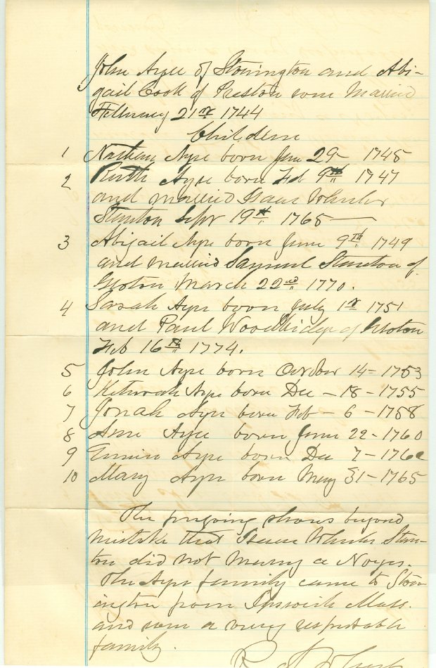 An undated list signed by Richard Anson Wheeler identifying children and spouses of John & Abigail (Cook) Ayer of Preston CT (married 2/21/1744). Names : Nathan, Ruth, Abigail, Sarah, John, Jonah, Mary, Eunice, Amy (?) and Kitmak (Sp?) Ayre; Isaac W. Stanton, Samuel Stanton, and Paul Woodbridge. One piece. 7 3/4" x 12 1/4"