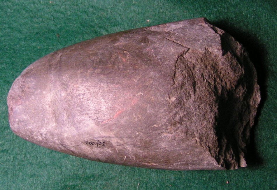 Large celt. of slate. Beveled, edge very rough. No provenience.