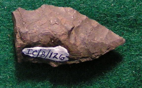 Thick, crooked, one side, noticeably notched, broken base.