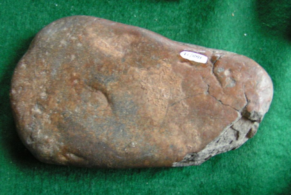 Granite like celt. Outer surface reddish brown, very smooth and polished, not very sharp edge. Fracture at blunt end shows a dark gray rough rock composition.