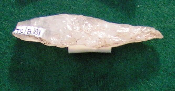 Small, narrow, thick moderately pronounced side notches, straight stem, oblique base.
