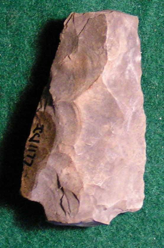 Gray flint, straight stemmed arrowhead, w/ broken tip and portion of base. No provenience.