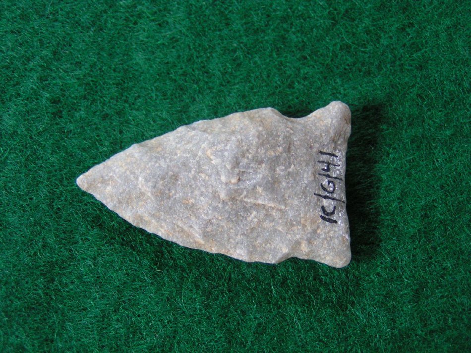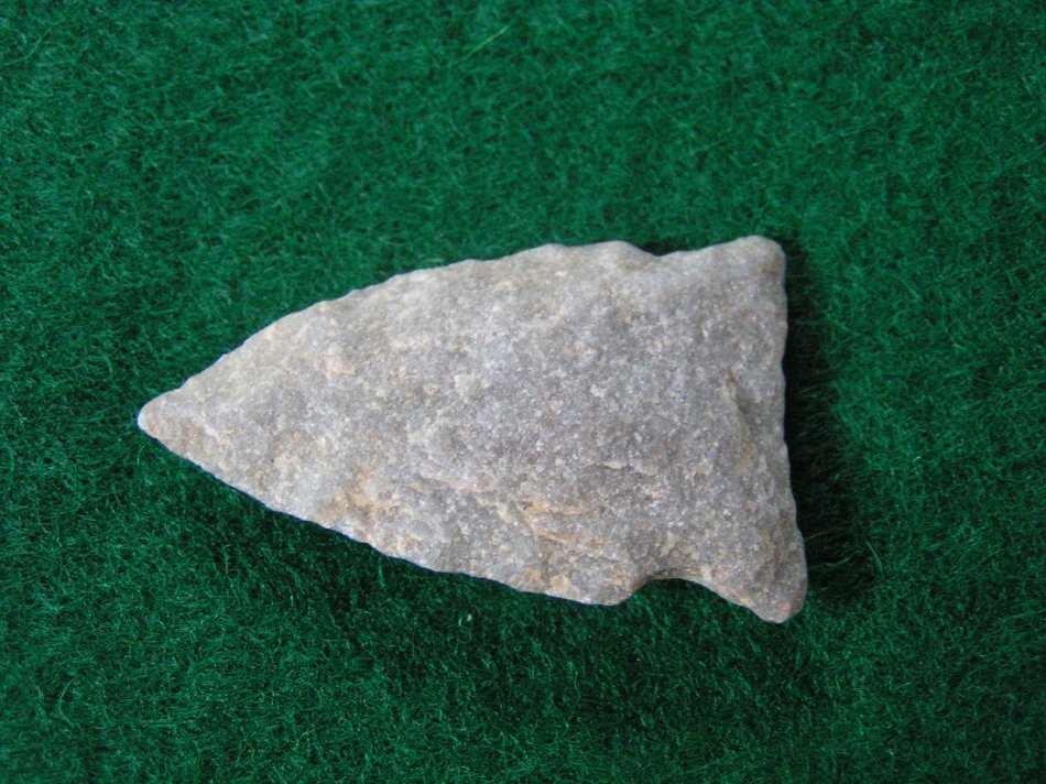 Blade is ovoid in outline with slightly excurvating edges and side notched stem. Broad stem with flat base and carefully chipped small ears. Bi–convex in cross–section.