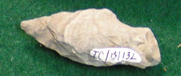 One side has distinguishable notch, other does not. Edges are convex, base slants up to one side.