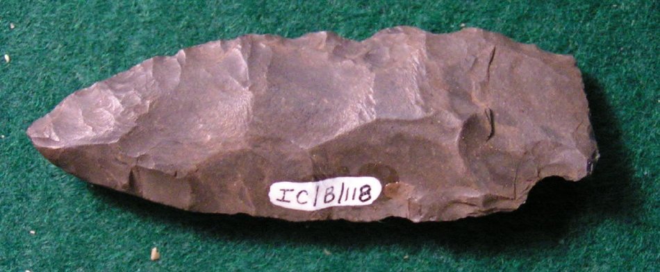 Long, narrow, flat base, edges slightly convex, only one side notch. Distinguishable roughly worked.