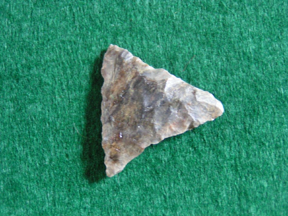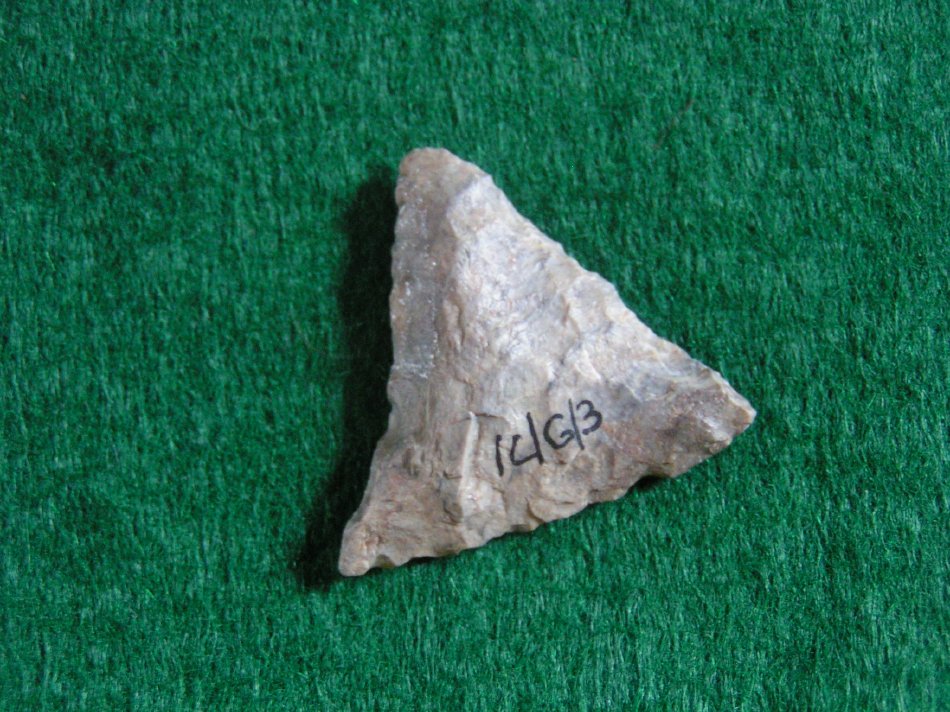 Equilateral edges slightly concave with straight base. Bi–convex in cross–section. This piece shows a finely chipped set of markings by pressure flaking.