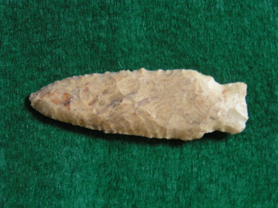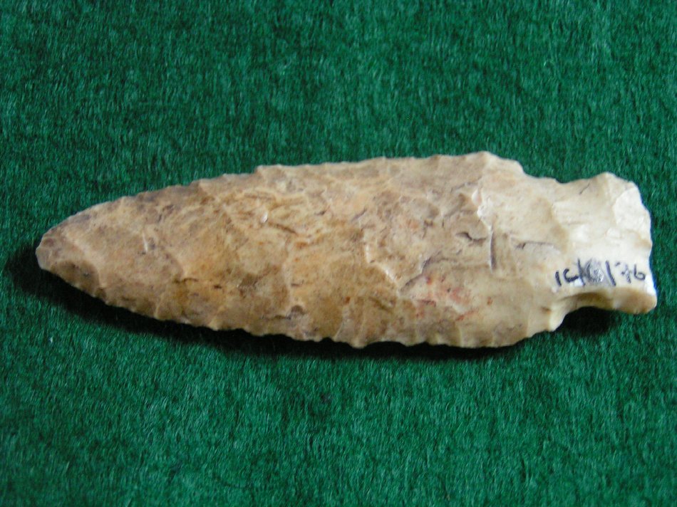 Isosceles triangle in blade outline. Slightly convex edges. Insloping shoulders with angled stem and fairly flat base. Generally flat in cross–section. Good signs of pressure flaking.