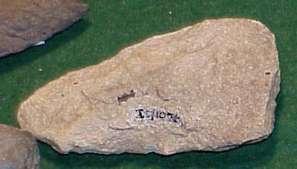 Triangular sandstone projectile point with rounded trip and flat base. No provenience. ICRC artifact.