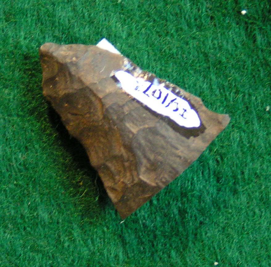 Small, triangular block flint arrowhead, no barbs, fine edges and flat end. Found by Shepaug River, CT. No provenience. ICRC misc. artifact.