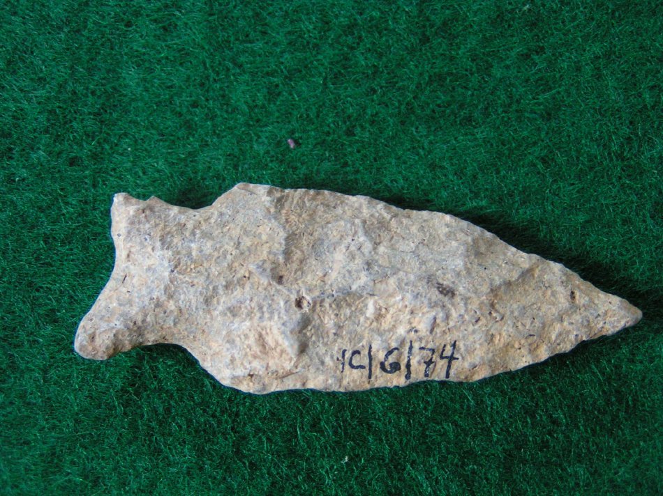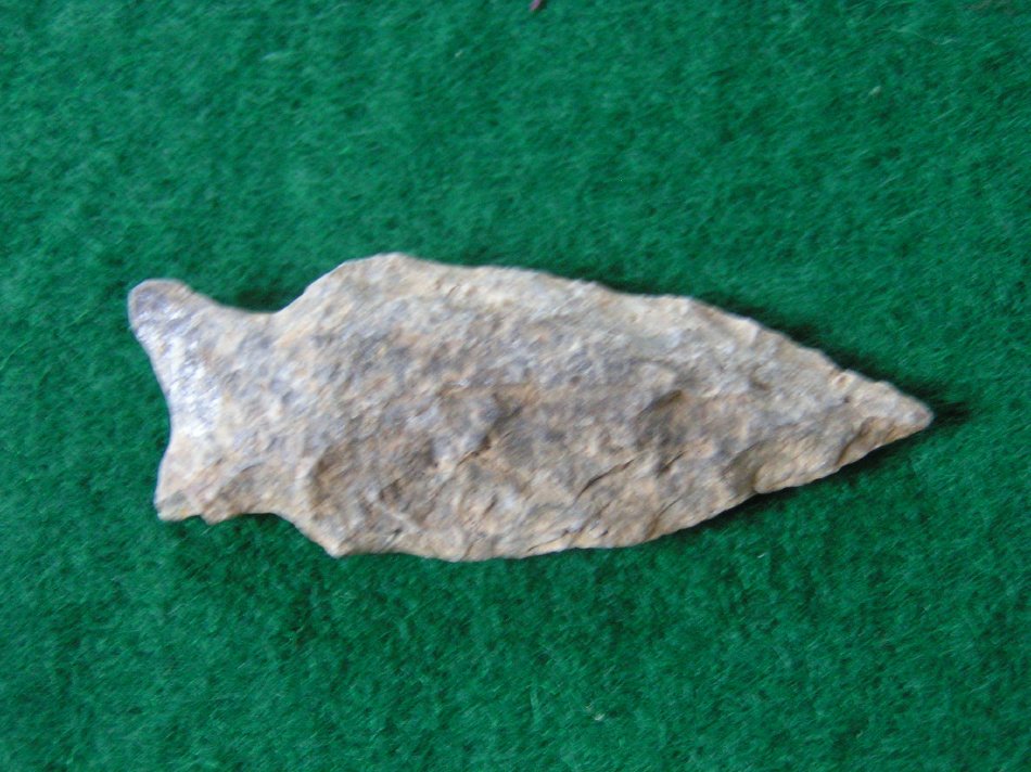 Blade ovoid in outline incurvating shoulder with lateral barb on stem with concave base. Bi–convex in cross–section.