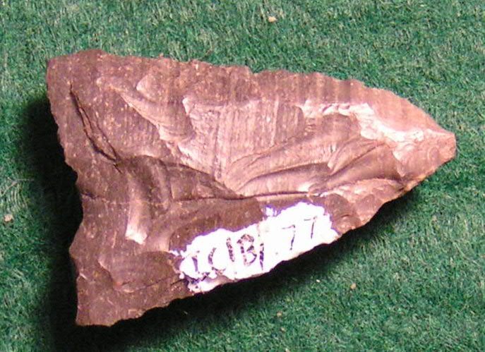 Iscoseles triangle base slightly concave, edges slightly excurvate, nearly flat in cross section, finely chipped pressure flaking. Texas.
