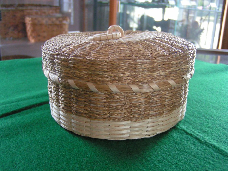 Basket made by Canadian Indians–Mikmaq, with lid. 6" in diameter and 3" tall.