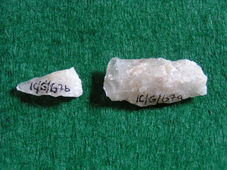 Triangular in outline with excurvate edges. Short stem with chipped base and convex. Bi–convex in cross–section. Parts A & B are from same original point. "A" is the base region.