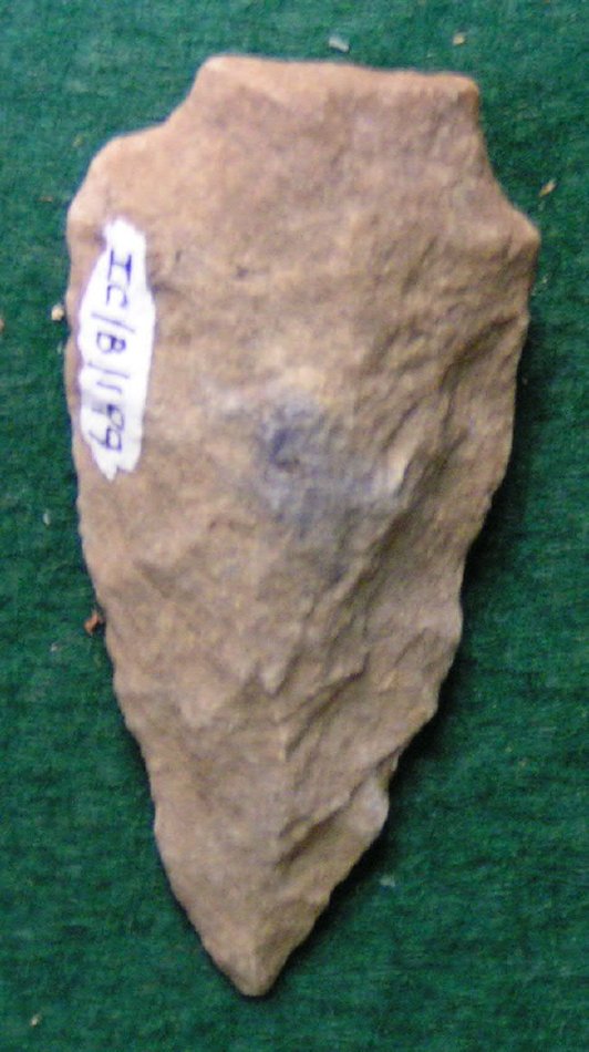 Well defined side notches, base broken, tapered shallow arc –– sides.
