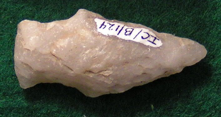Thick, narrow slightly convex base, shallow side notches, one edge convex, other straight.