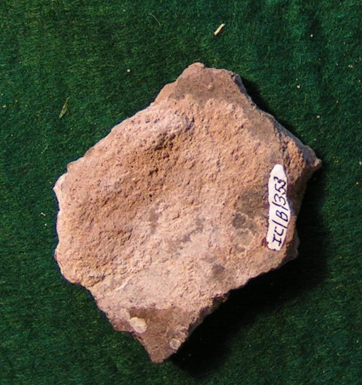 One side smooth, painted red, black and yellow; other side smooth, charred.